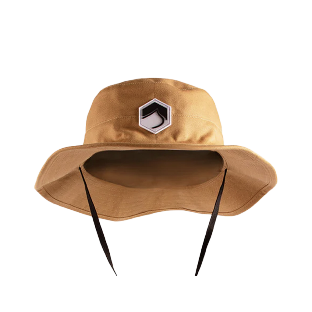 Cotton Twill Cinch Bucket Style Hat Rubber Hex Logo Badging Color: Tan