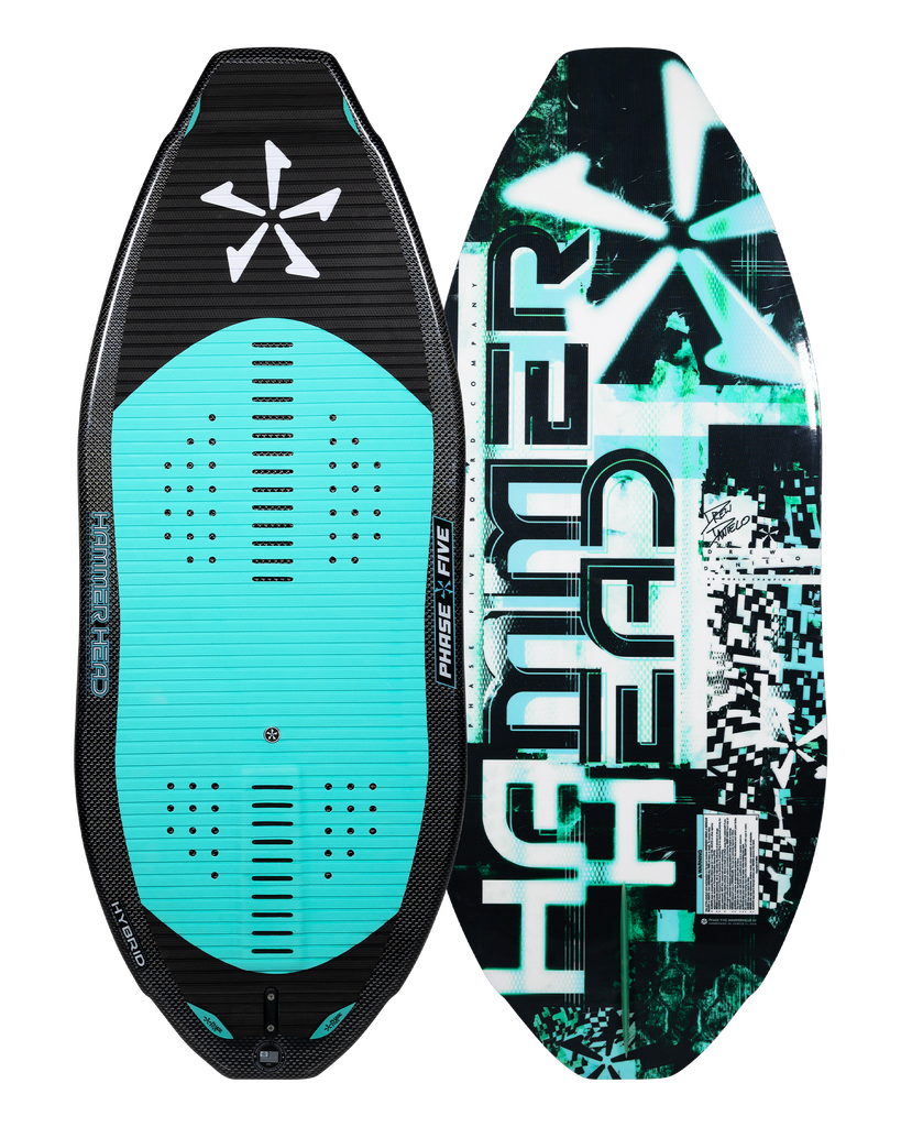 The Phase Five Hammerhead Wakesurfer is the king of revert. With a square nose and tail design, the Hammerhead delivers tons of speed and stability in both directions. Drew Danielo discovered that a traditional pulled in nose would struggle to ride backwards. This is where the Hammerhead triumphs. In addition, the peanut side rail design creates two contact points on the wave instead of one. This keeps the Hammerhead locked in and pointed down the line. The peanut outline adds surface area under each foot for increased maneuverability and speed than its predecessor. It features a full deck pad to take full advantage of riding revert and gives you the freedom to place your feet anywhere on the board! The Phase Five Hammerhead is built with Hybrid Carbon™ material and a single fin setup loaded with our 1” Skim Fin.